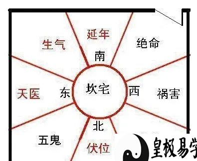 最先能够更改门的方向,图中坎宅假如门开在西北绝命凶位上,立即把手改在东南方、正南方等吉位便是。